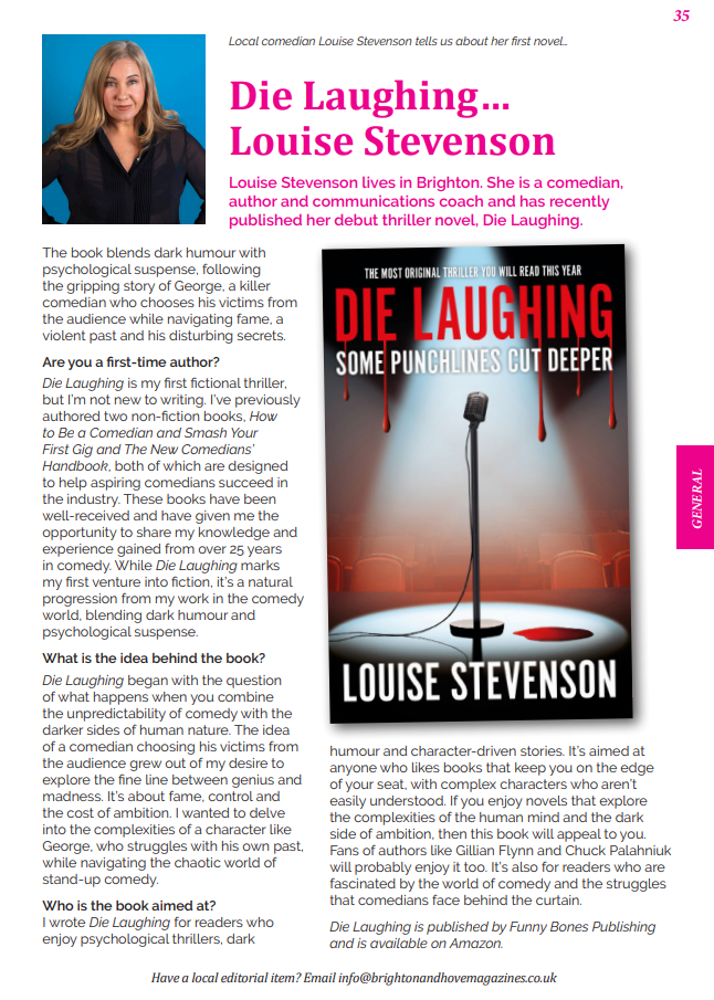 I’ve written three books: The New Comedian’s Handbook, How to Be a Comedian and Smash Your First Gig, and my debut psychological thriller Die Laughing, which was released this year. Storytelling, humour, and performance run through everything I do — and I bring all of that into my coaching.